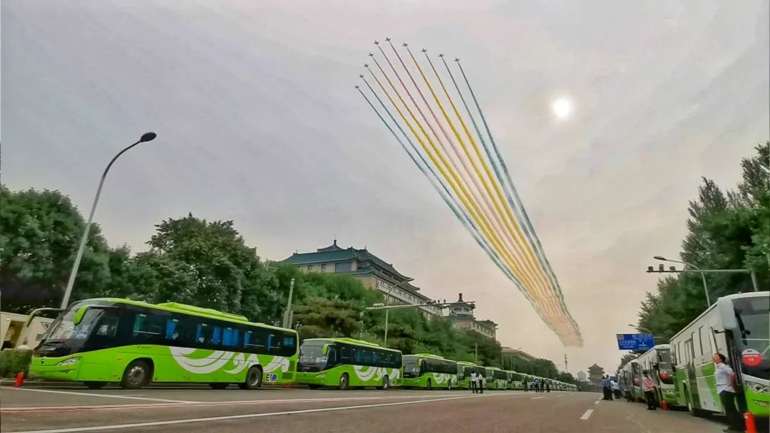 值得一提的是,服務保障車隊中的數十輛氫燃料客車,是國內最新一代的氫燃料客車產品,也是氫燃料客車首次大批量服務國家盛典活動。