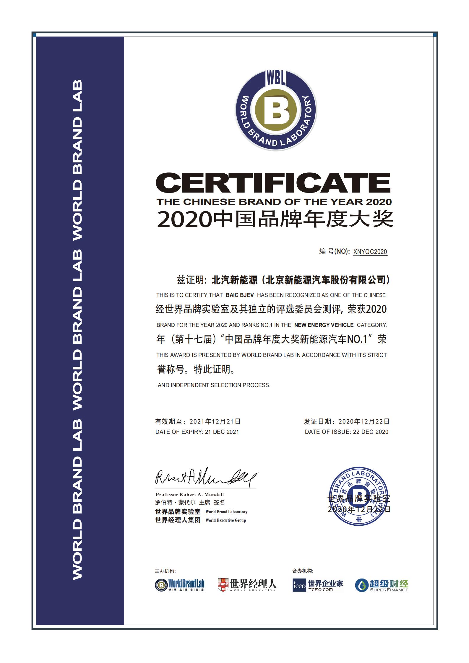 China Beijing, December 22nd 2020—Beijing Electric Vehicle Co., LTD (BAIC BJEV) is listed into 2020 Chinese Most Influential Brands (17th edition) as the sole new energy vehicle company. This highly recognized Chinese brand Oscar is organized and evaluated by World Brand Lab and its independent selection commission, which covers over 35 industrial leaders in 2020 such as Huawei, Air China and Xuzhou Construction Machinery Group.