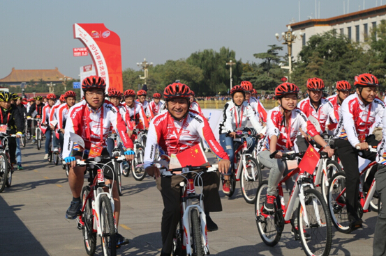 比賽之外,更加引人矚目的當(dāng)屬“榮譽(yù)騎行”環(huán)節(jié):只見(jiàn)350位身著專(zhuān)業(yè)自行車(chē)比賽服的騎手,腳蹬亮眼的公路自行車(chē),緊跟大部隊(duì)之后,環(huán)繞天安門(mén)廣場(chǎng)進(jìn)行了1.7公里的騎行。本以為他們也是專(zhuān)業(yè)的騎手,一問(wèn)下來(lái)才知道,原來(lái)他們都是本次“環(huán)京賽”保障團(tuán)隊(duì)和贊助團(tuán)隊(duì)的工作人員。用“環(huán)京賽”組委會(huì)負(fù)責(zé)人的話說(shuō)就是,希望用“榮譽(yù)騎行”這種形式回饋為“環(huán)京賽”作出貢獻(xiàn)的人們,同時(shí)也讓他們參與到自行車(chē)這項(xiàng)運(yùn)動(dòng)員中來(lái),讓綠色出行成為新的選擇、新的行為方式。