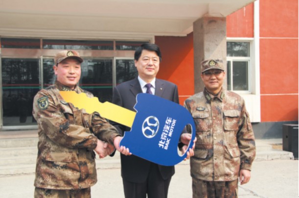 北京股份公司3月26日向駐守在順義的北京衛(wèi)戍區(qū)66168 部隊贈送6輛“勇士”軍車儀式在66168部隊舉行。北汽股份總裁韓永貴、北京分公司領(lǐng)導(dǎo)參加了交車儀式。