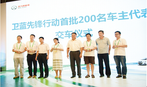 7 月13 日,“衛(wèi)藍(lán)先鋒行動(dòng)”首批200 名純電動(dòng)車主交付車輛儀式在北汽新能源公司舉辦。同時(shí)還聘請(qǐng)了潘曉婷、顧俊、高敏、楊凌等世界冠軍擔(dān)任“北京綠色出行大使”。北京市有關(guān)領(lǐng)導(dǎo)出席儀式,北汽集團(tuán)董事長、副總經(jīng)理張欣,北汽新能源公司總經(jīng)理鄭剛一同參加活動(dòng)。將車鑰匙交給首批“衛(wèi)藍(lán)先鋒”車主代表,并向四位世界冠軍頒發(fā)了“北京綠色出行大使”聘書。